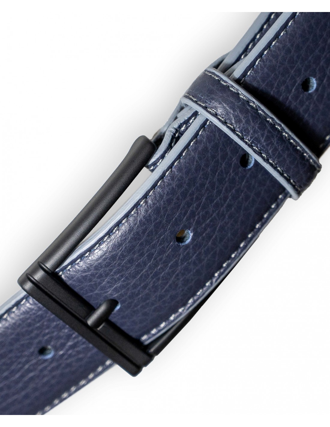 Enhance your style with this 100% calfskin belt in contrasting blue and grey. A perfect combination of elegance and durability, calfskin, with its sophisticated texture, ensures exceptional comfort and long-lasting durability. The classic design makes this belt a versatile accessory, ideal for completing both formal and casual outfits.