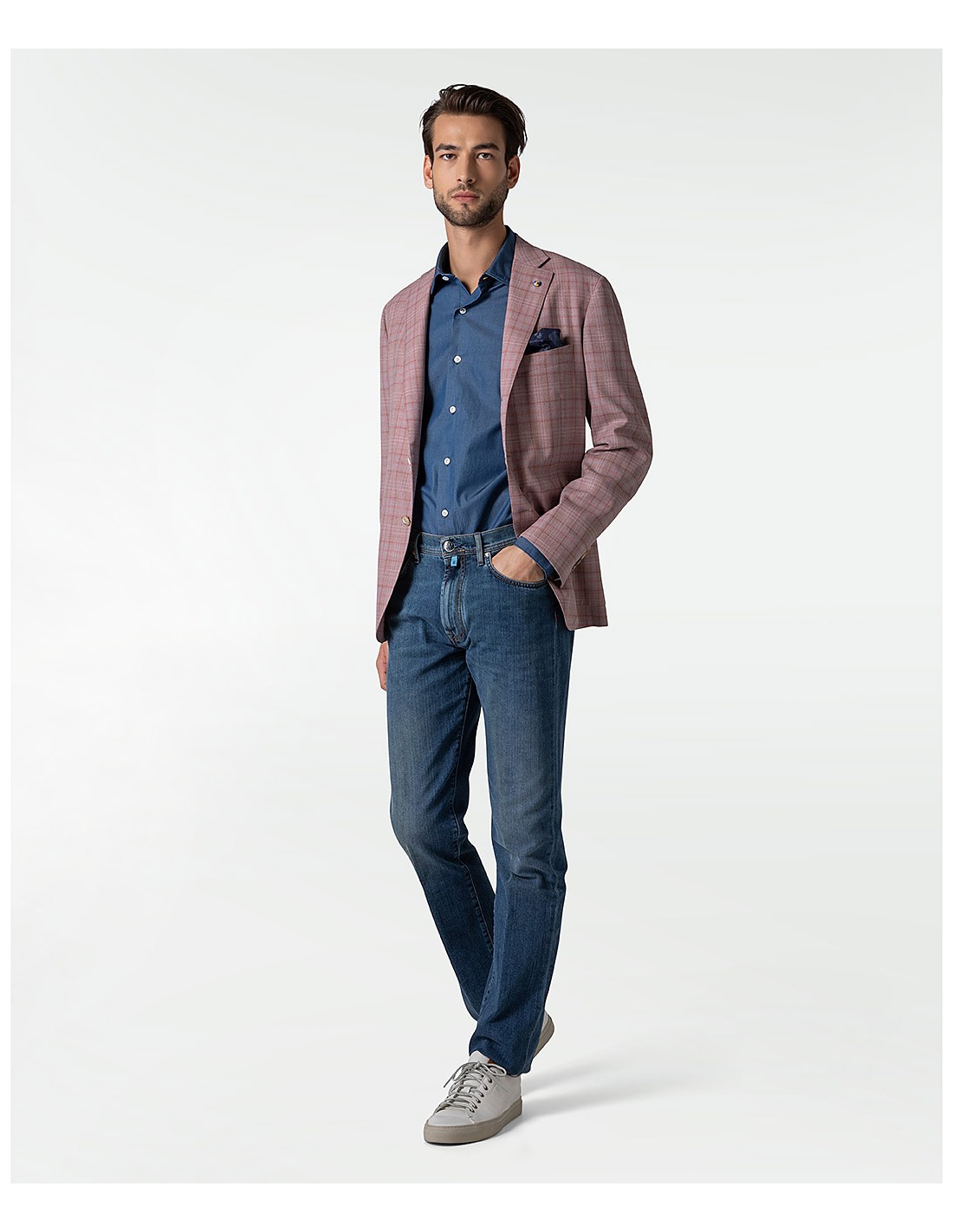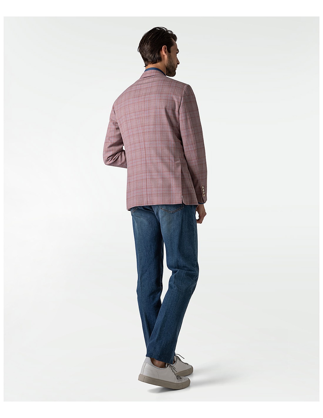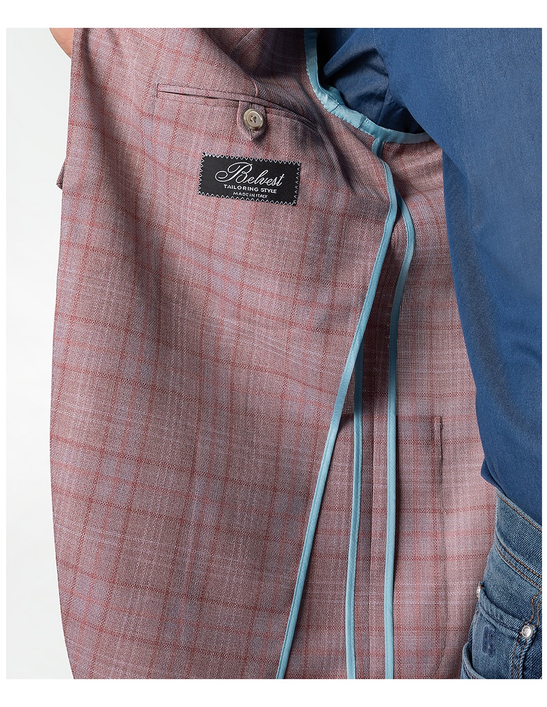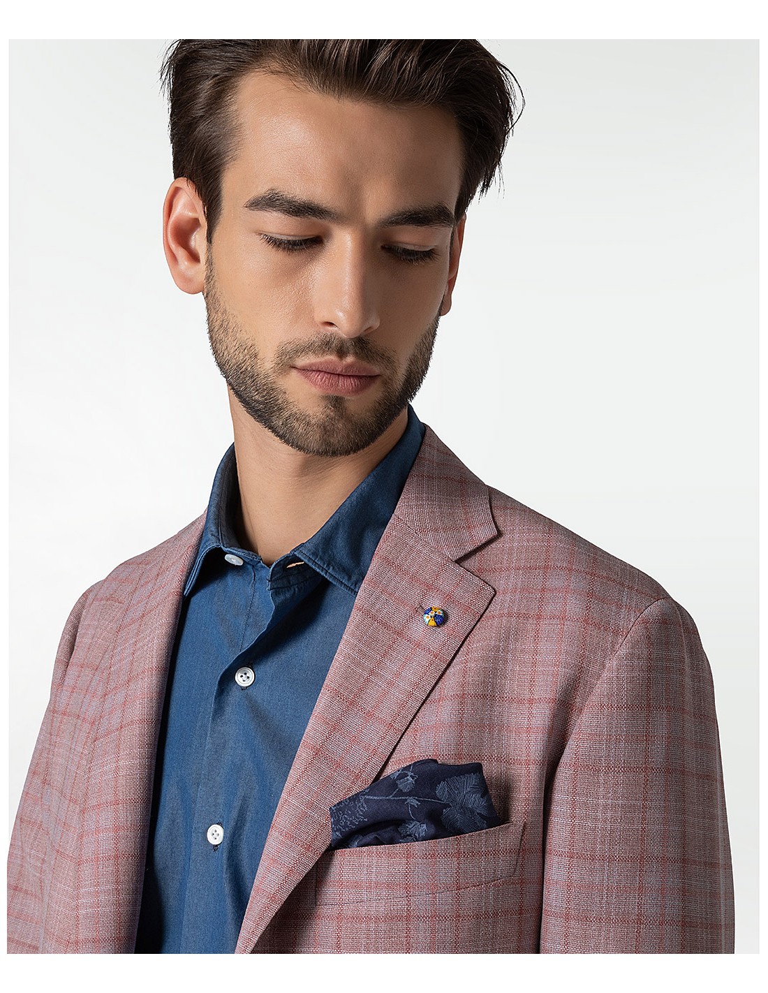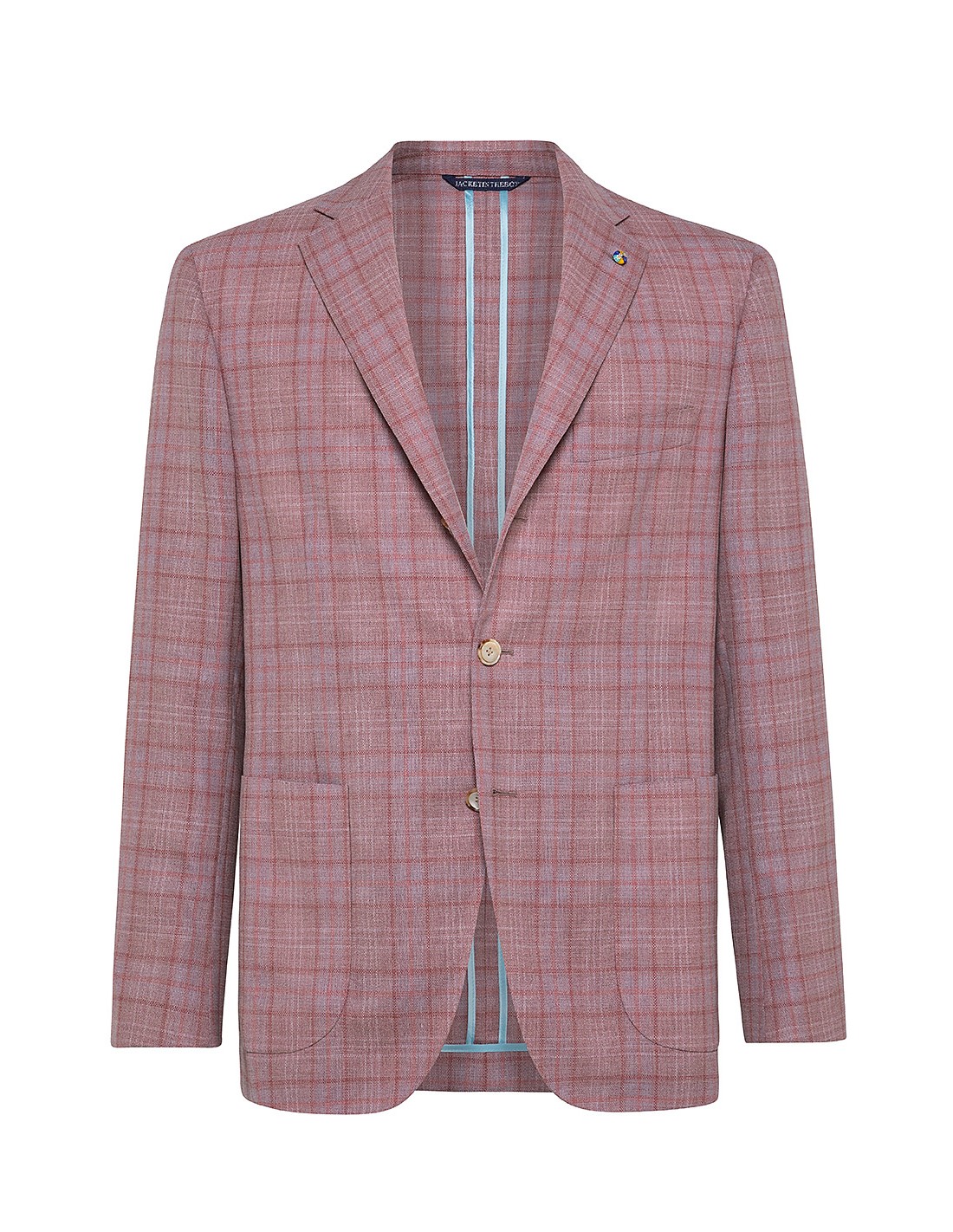 A style that doesn't force you to choose between functionality and elegance is indispensable to your feeling at ease with yourself at all times. With this need in mind we created the dusty rose jacket, choosing an over-check pattern in fine woolen fabric. This jacket is part of the JACKETINTHEBOX© line, our exclusive offer of unlined and unstructured garments, designed to be feather-light while being worn and practical should they have to be packed in a suitcase while traveling. This is a single-breasted jacket with three buttons pressed to two, has a classic notched lapel, and also features two patch pockets and a breast welt pocket for easily organizing the items always with you. Thanks to the relaxed fit of the shoulders, you'll always be at ease, with maximum freedom of movement, feeling comfortable and elegant. The small Murrina lapel pin makes the jacket even more distinguished, and is a tribute to your style and to your desire for individualism. This garment too, was Made in Italy in our Piazzola sul Brenta atelier , where the expert and patient hands of our master craftsmen select and work on the finest fabrics the world can offer.