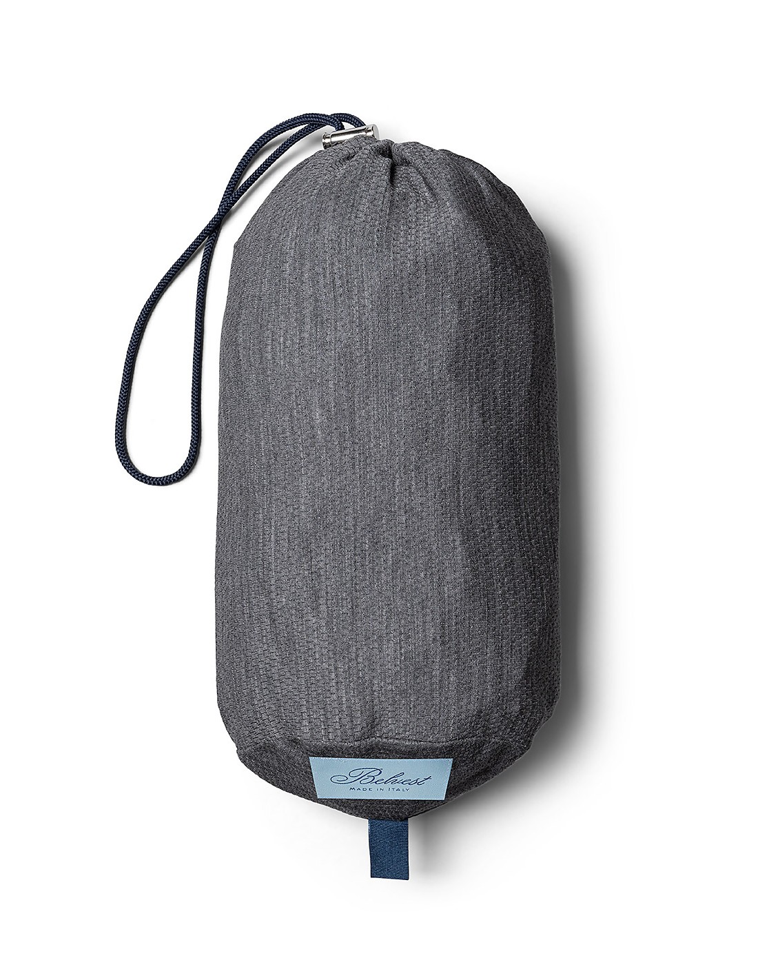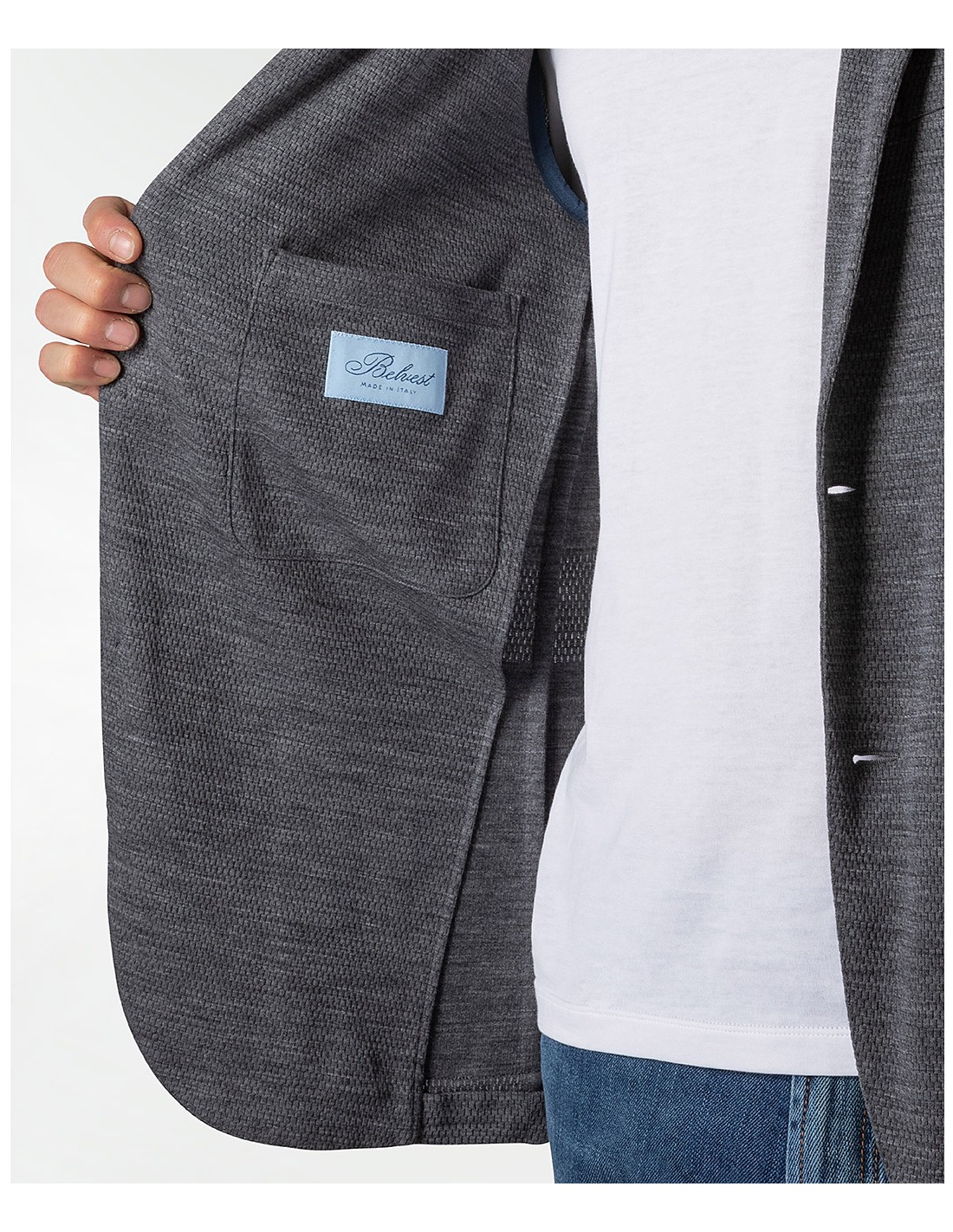 Whatever your destination today, we believe that style should give you the confidence for feeling completely at ease on every occasion. This jacket comes in a high-quality Super 120s wool, gray jersey fabric, and has a soft and regular fit. The garment is made to be folded into a bag of the same fabric, so that it can be put into your suitcase without it creasing. This single-breasted, two-button jacket has a classic lapel, with two patch pockets and a slanted breast welt pocket. We created it fully unlined and unstructured, to give you the pleasure of wearing it, morning to night, without needing to change. The small Murrina lapel pin makes the jacket even more distinguished, and is a tribute to your style and to your desire for individualism. Each garment is a little gem of sartorial perfection: they are hand-made in our Piazzola sul Brenta atelier by our master craftsmen who select and work with the finest fabrics the world can offer.