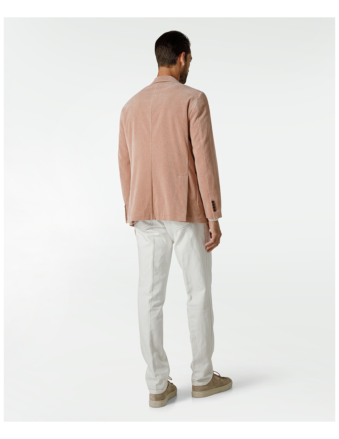 Classic, elegant, durable. The salmon-colored corduroy jacket is the ideal garment if you are looking for a distinctive style and a refined look. For this single-breasted jacket, with a soft and regular fit, we have chosen a stylish color such as salmon pink, perfect for combining with neutral colors, without however excluding bolder contrasts. We patterned it on a contemporary silhouette, leaving the jacket completely unlined and unstructured. These features make the garment practical and versatile, ideal for combining with casual pants as well, for a less formal style. The single-breasted jacket with three buttons pressed to two has a classic lapel. It has two practical patch pockets and a slanted breast welt pocket for conveniently organizing items you always carry with you. Each jacket is created in Italy, at our Piazzola sul Brenta atelier, where the expert and patient hands of our capable seamstresses select and work with the finest fabrics in the world.