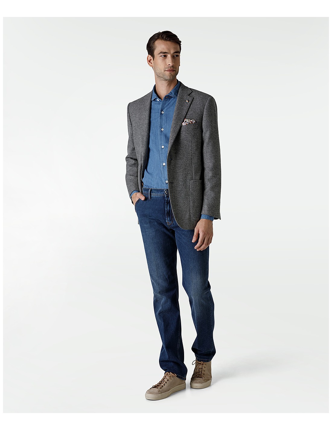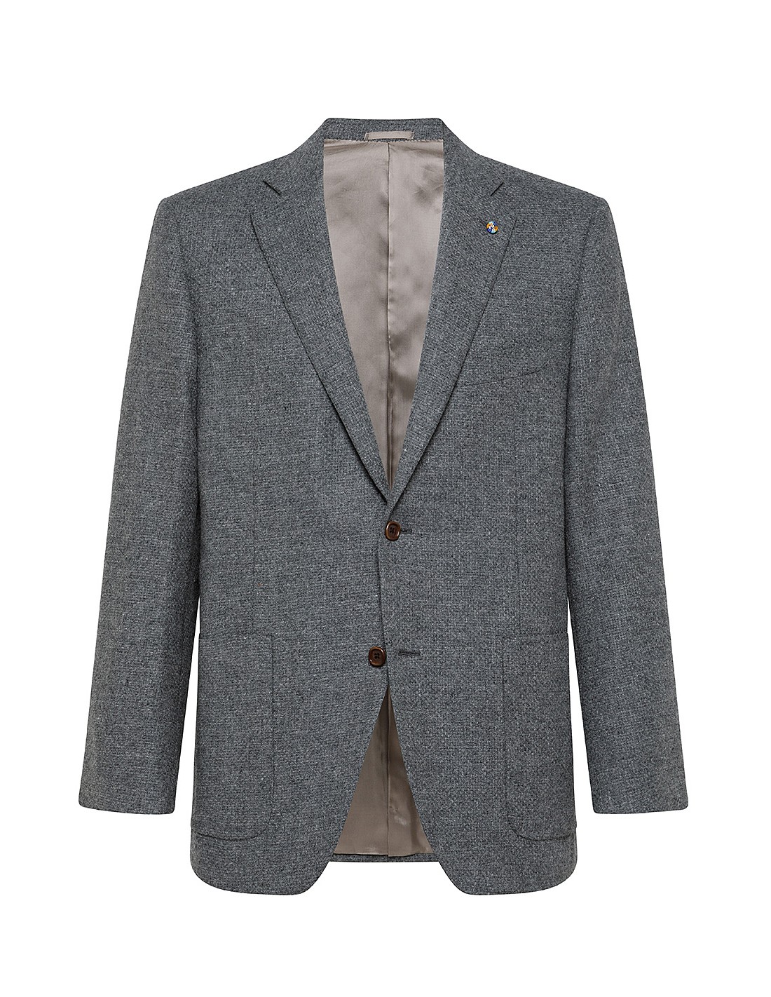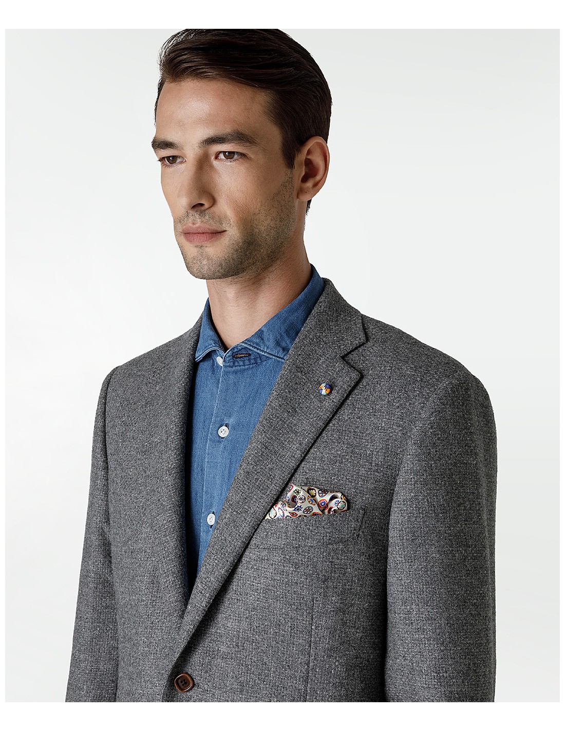 Feeling confident on every occasion is the indispensable condition for staying true to yourself and your style. For this grey wool-cashmere blazer we have chosen an Eco-Friendly fabric. The wool used from the sheep’s fleece is complete unharmed and pristine. The absence of chemical dyes emphasizes the beauty and softness of the fabric. The jacket is a two-button single breasted, a classic lapel and is fully lined. Thanks to the two patch pockets and the small slanted breast pocket you can always have what you need at hand. The small Murrina lapel pin makes the jacket even more distinguished and is a tribute to your style and to your desire for individualism.