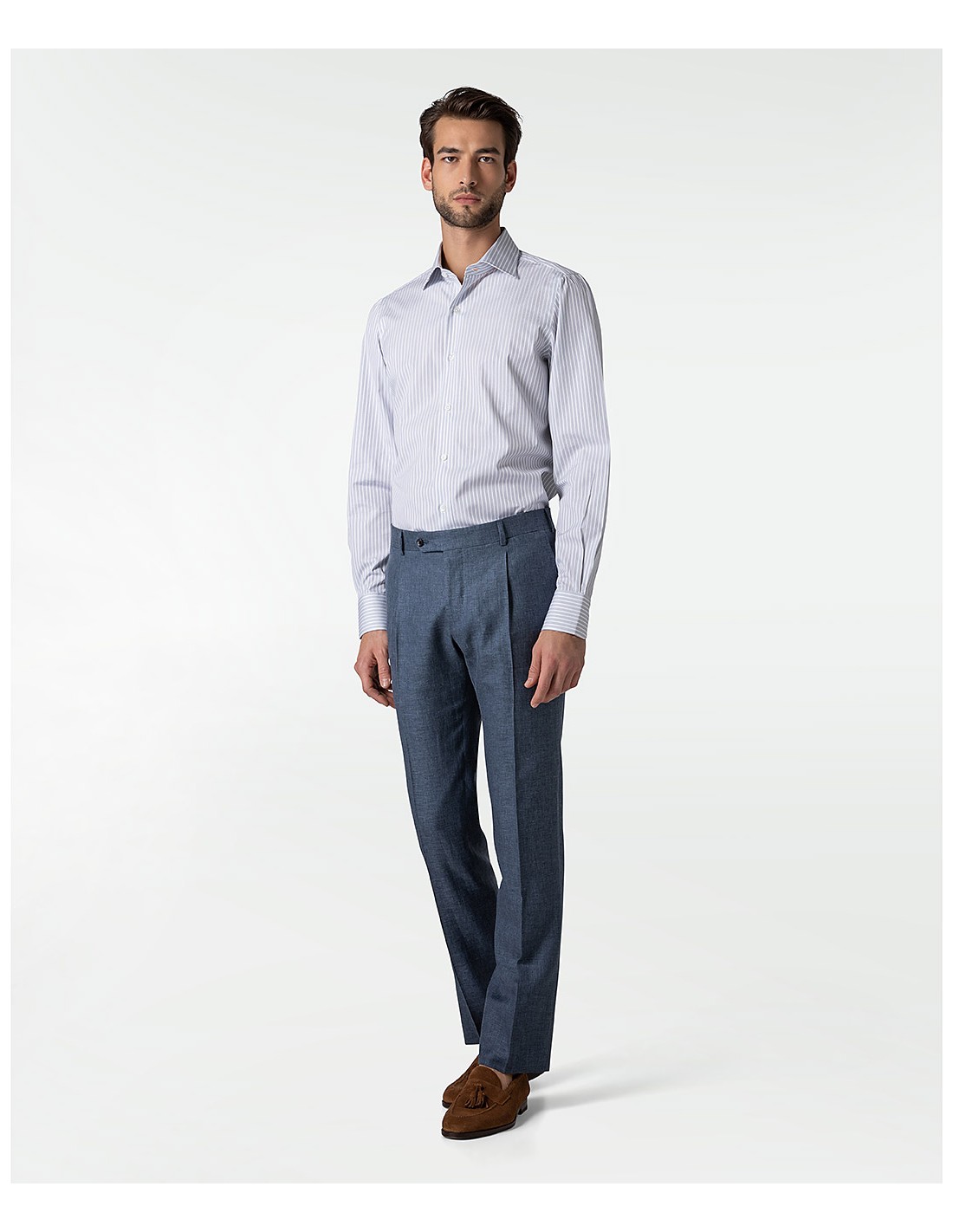 When we imagine a garment, we like to think of the pleasure it will be giving you when wearing it. Because for us the true essence of our work lies in the reassuring marvel of beauty, in the love for things well-done. Like a Belvest shirt. This model in white with blue stripes has a comfortable and regular fit. Made from cool cotton, it makes you feel at ease and impeccable from the morning until evening. The neck is hand sewn to ensure the correct stitch tension and also, that once the garment has been put on, it complements the shape of your body like a second skin. We also insert a reinforcing gusset to make the seam between the front and the back of the shirt more resistant. Each garment is a jewel of sartorial perfection, handcrafted by our master tailors who select and work with the most precious fabrics in the world in our Piazzola sul Brenta workshop.