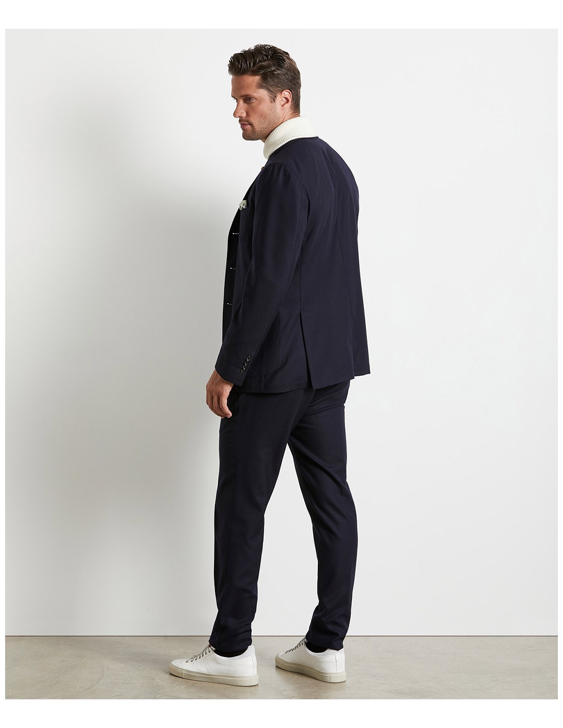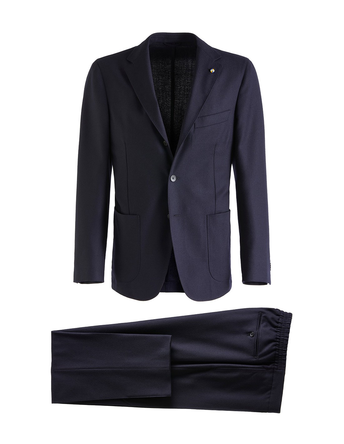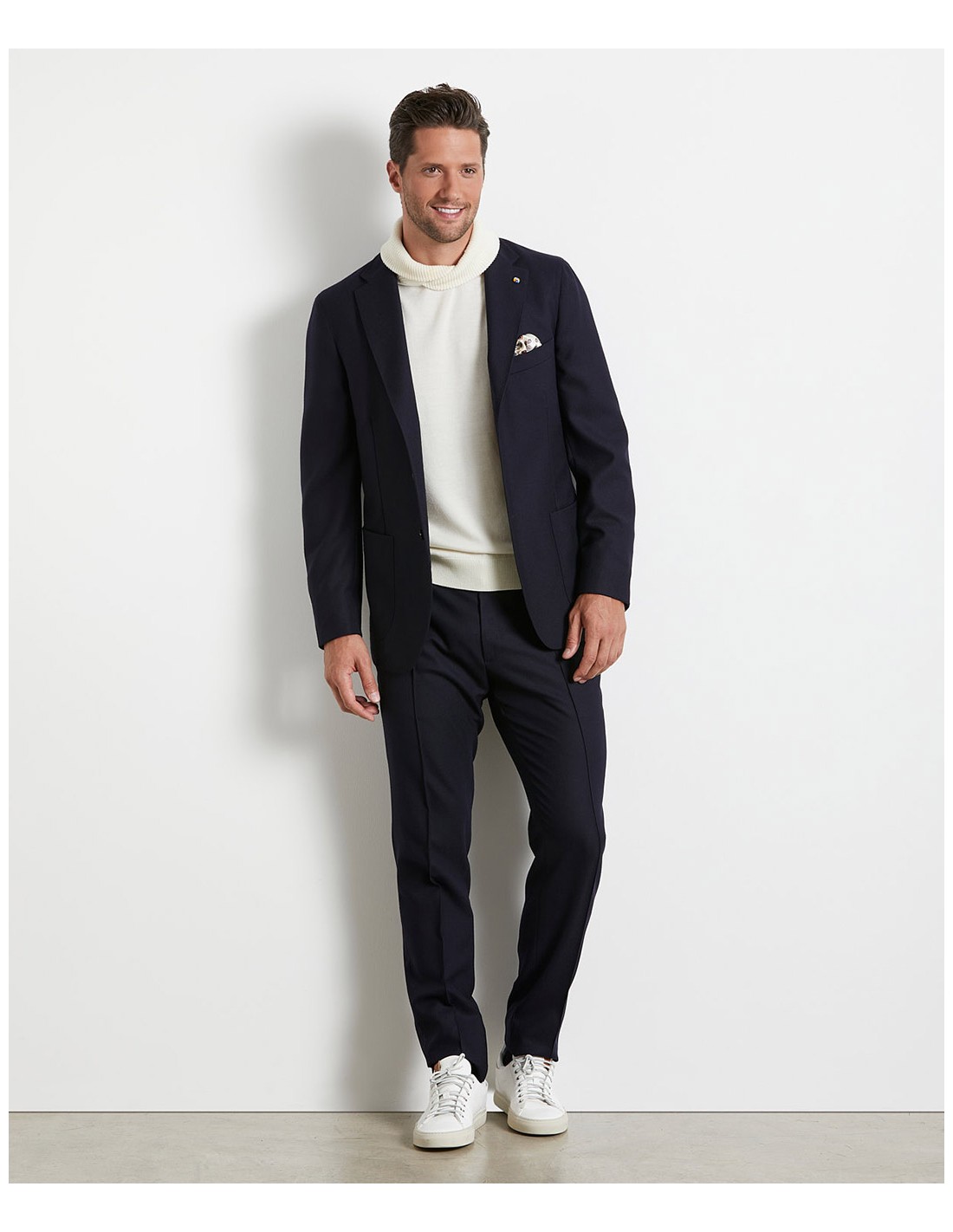 Having impeccable style is the essential condition to avoid limiting your need to be constantly on the move. For this reason, we have created the DYNAMIC WASHABLE technology: thanks to this innovative fabric, the garment can be machine washed, choosing a normal 30°C cycle. Furthermore, once washed, it is enough to hang it up and leave it to dry, without ironing being needed. For this suit we have chosen a fine Super 130s navy blue wool, with a delightful feel to the touch, to create a soft and regular fit. The jacket has a classic lapel, and is single breasted with three buttons “pressed to two”; its particular feature is in being totally unlined and unstructured, making it feather-light and impalpable when worn. Every detail was minutely studied, beginning with the two patch pockets and a small slanted breast pocket, allowing you to always have everything you need at hand. Finally, the matching trousers are characterized by a crease sewn at the front and an elastic-backed waistband; the final touch is given by the side pockets, with a watch pocket detail.