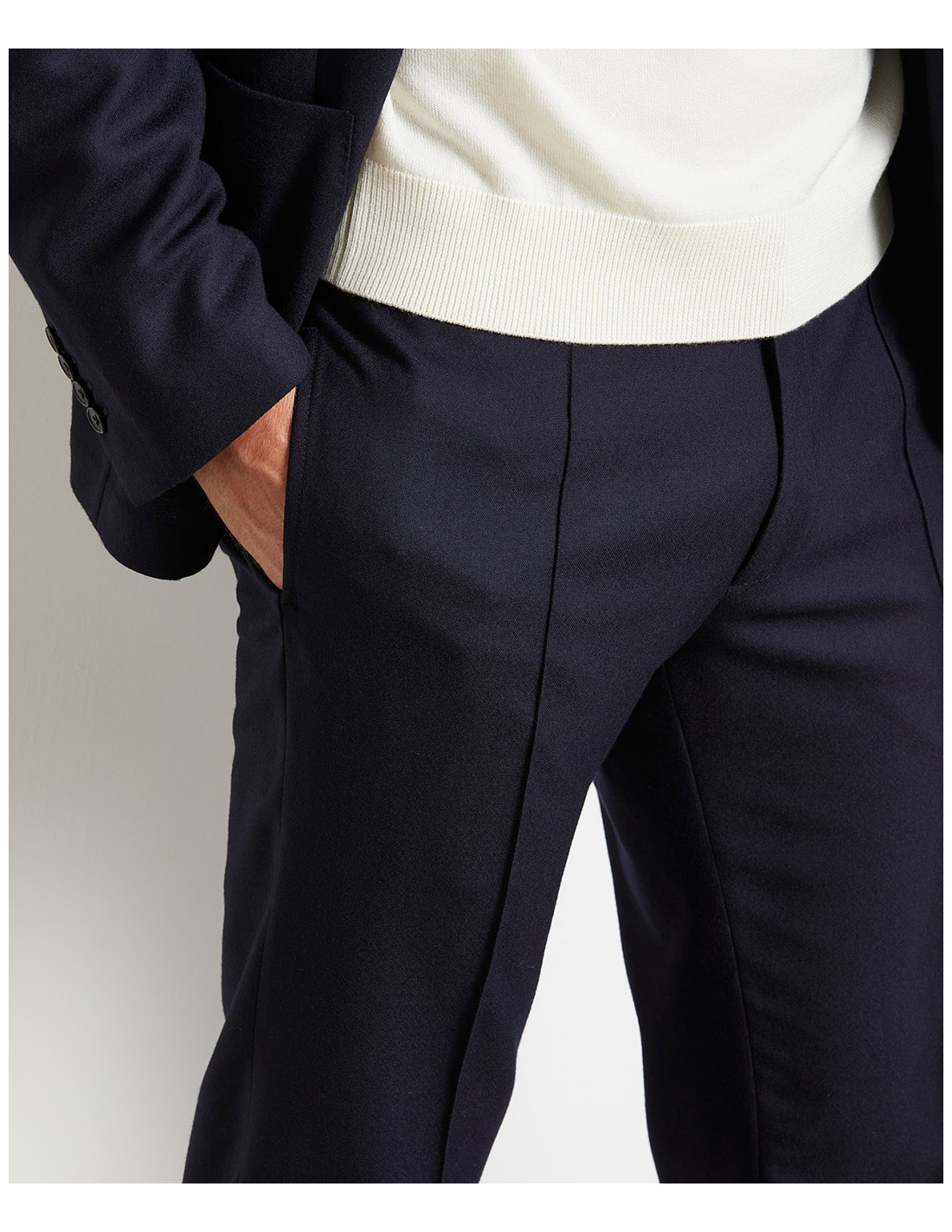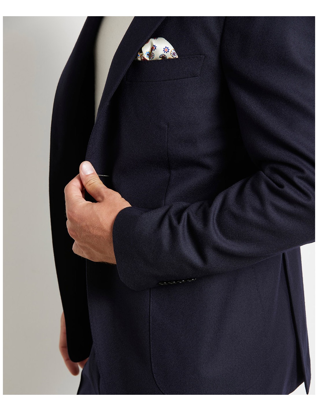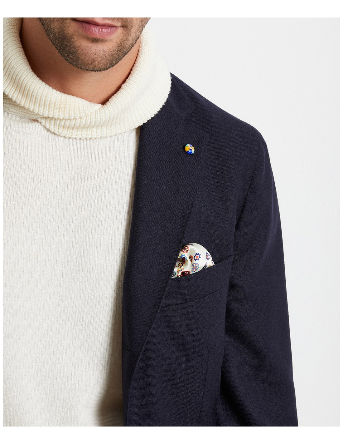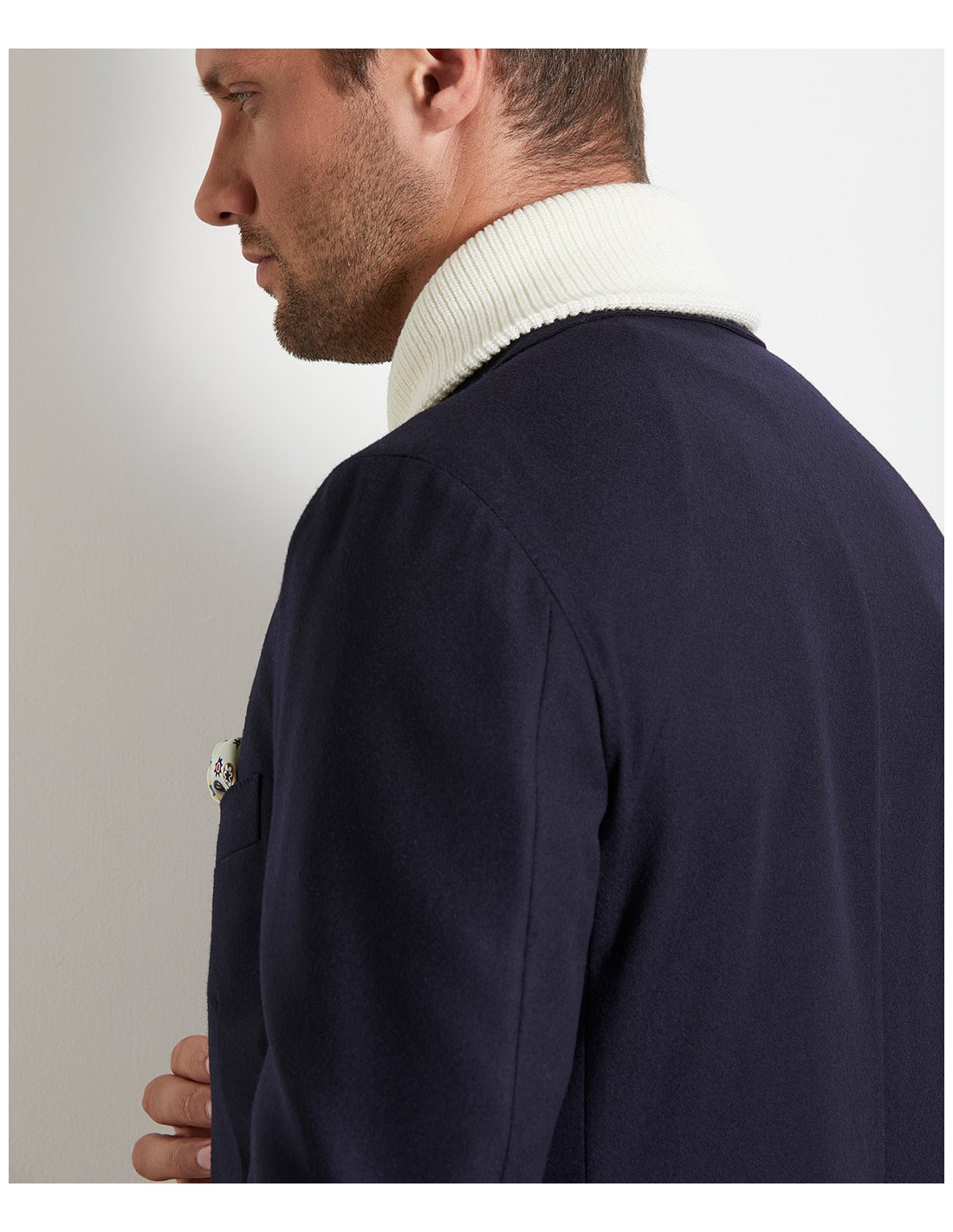 Having impeccable style is the essential condition to avoid limiting your need to be constantly on the move. For this reason, we have created the DYNAMIC WASHABLE technology: thanks to this innovative fabric, the garment can be machine washed, choosing a normal 30°C cycle. Furthermore, once washed, it is enough to hang it up and leave it to dry, without ironing being needed. For this suit we have chosen a fine Super 130s navy blue wool, with a delightful feel to the touch, to create a soft and regular fit. The jacket has a classic lapel, and is single breasted with three buttons “pressed to two”; its particular feature is in being totally unlined and unstructured, making it feather-light and impalpable when worn. Every detail was minutely studied, beginning with the two patch pockets and a small slanted breast pocket, allowing you to always have everything you need at hand. Finally, the matching trousers are characterized by a crease sewn at the front and an elastic-backed waistband; the final touch is given by the side pockets, with a watch pocket detail.