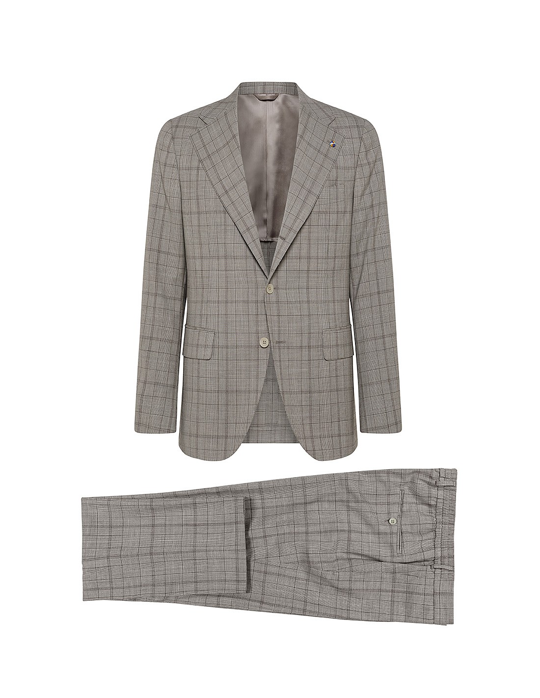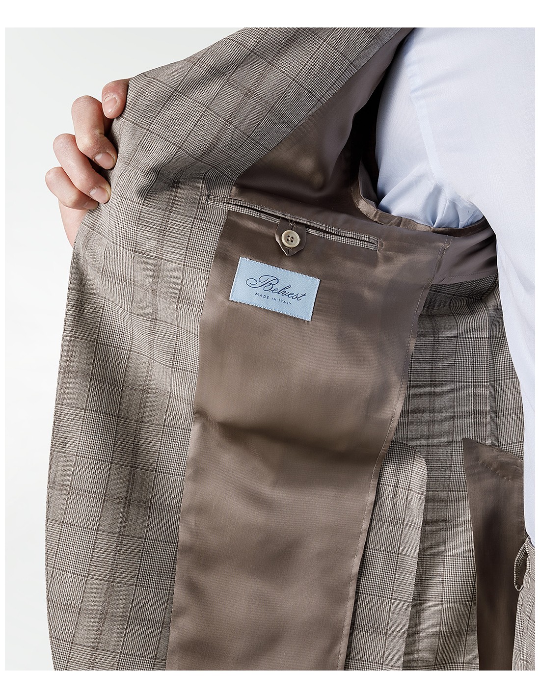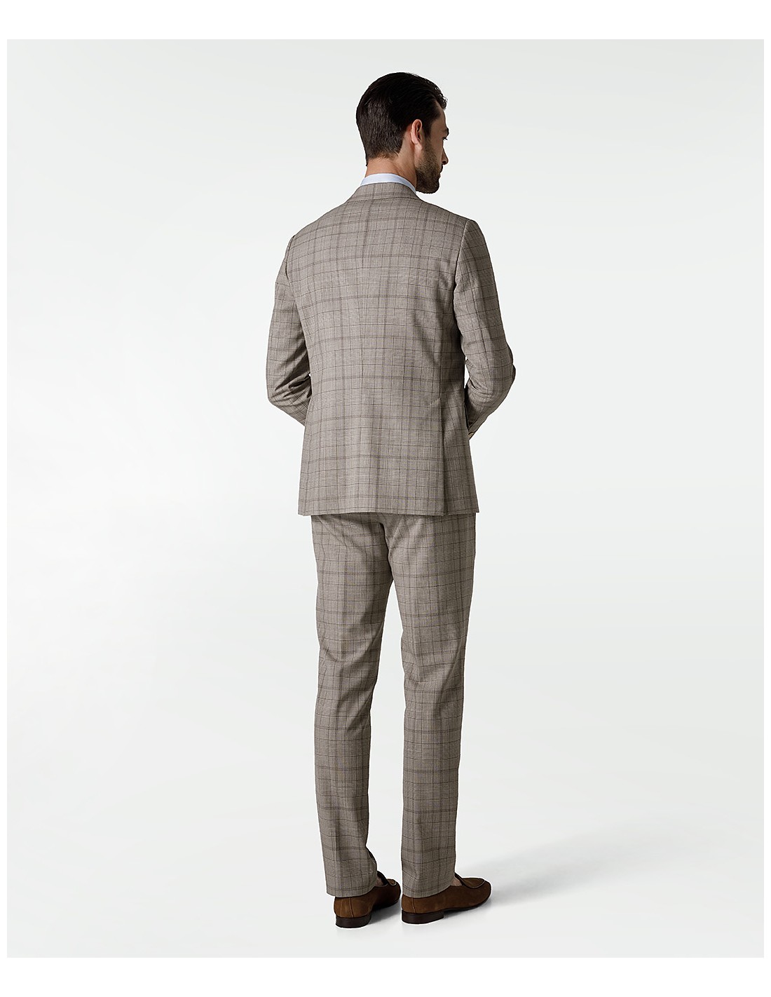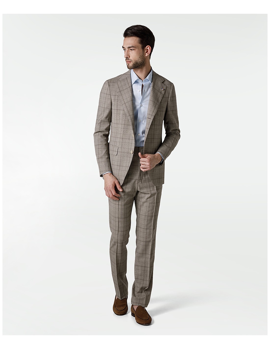 This unlined single-breasted suit in pure wool crafted in beige Prince of Wales with macro check, enhances the sartorial slim fit model. It offers exceptional comfort being naturally stretch, but without any synthetic fibre. This single-breasted, half-lined jacket with three buttons on the front stretched to two, horizontal welt pockets with flap, a slanted breast welt pocket. Matched trousers, featuring practical American Style pockets.