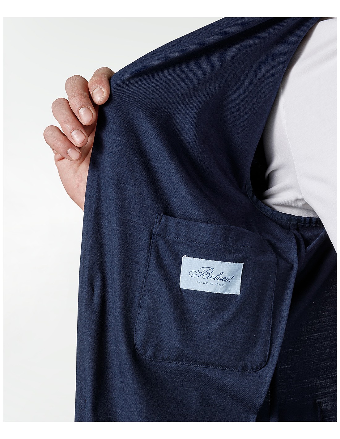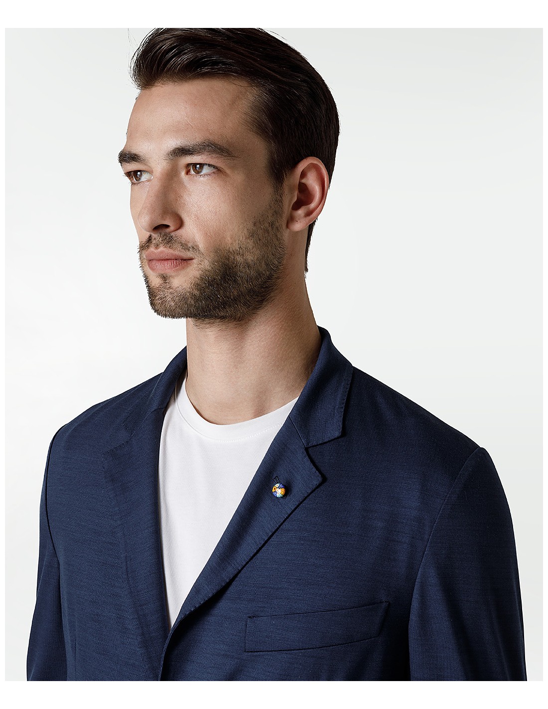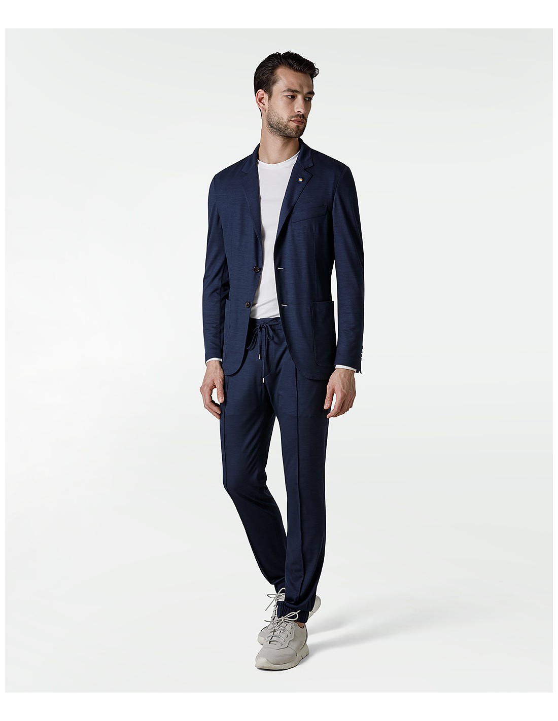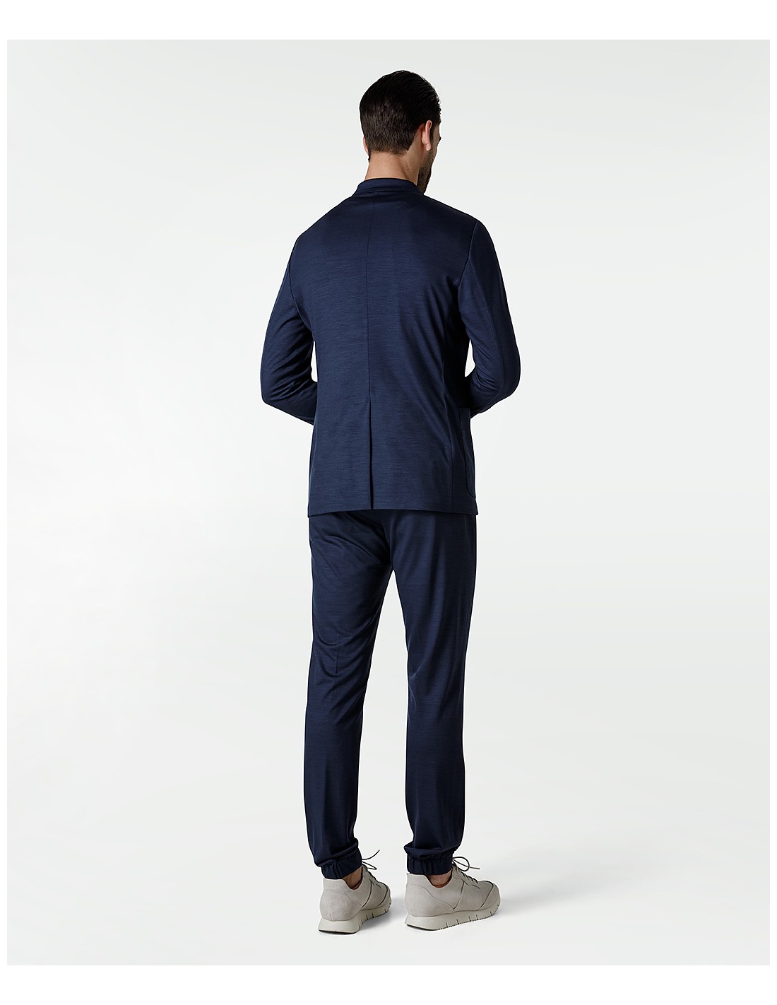 This advanced technology single-breasted suit is the perfect combination between form and function. Fabricated in a particular and innovative unconstructed, 2 buttons on front form this suit is designed to look smart and perform well, making it ideal for those who are always on the move. It is cut from 17.75 micro in New Zealand wool certified Marino ZQ (mulesing free) and fully traceable. It is naturally elastic but without any synthetic yarn thanks to the selection of wools and specific finishes. This athletic leisure suit is produced in a high compact yarn that gives a special shine without the use of any fixing raising. Matched trousers with American pockets and belt coulisse.