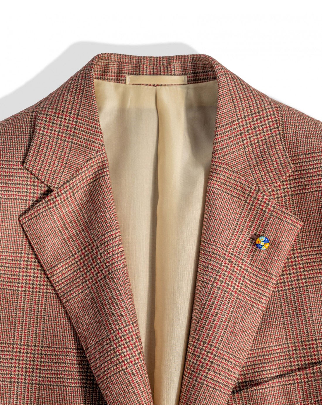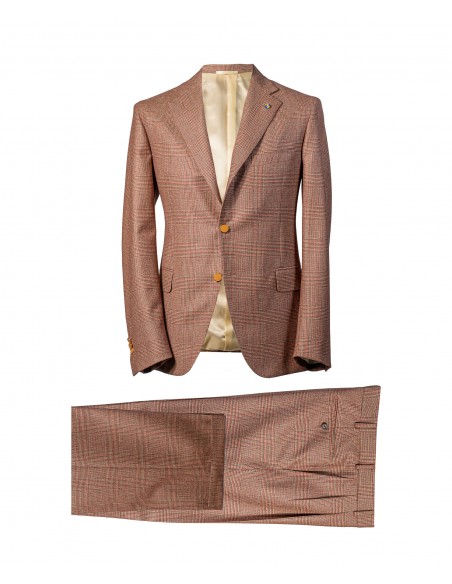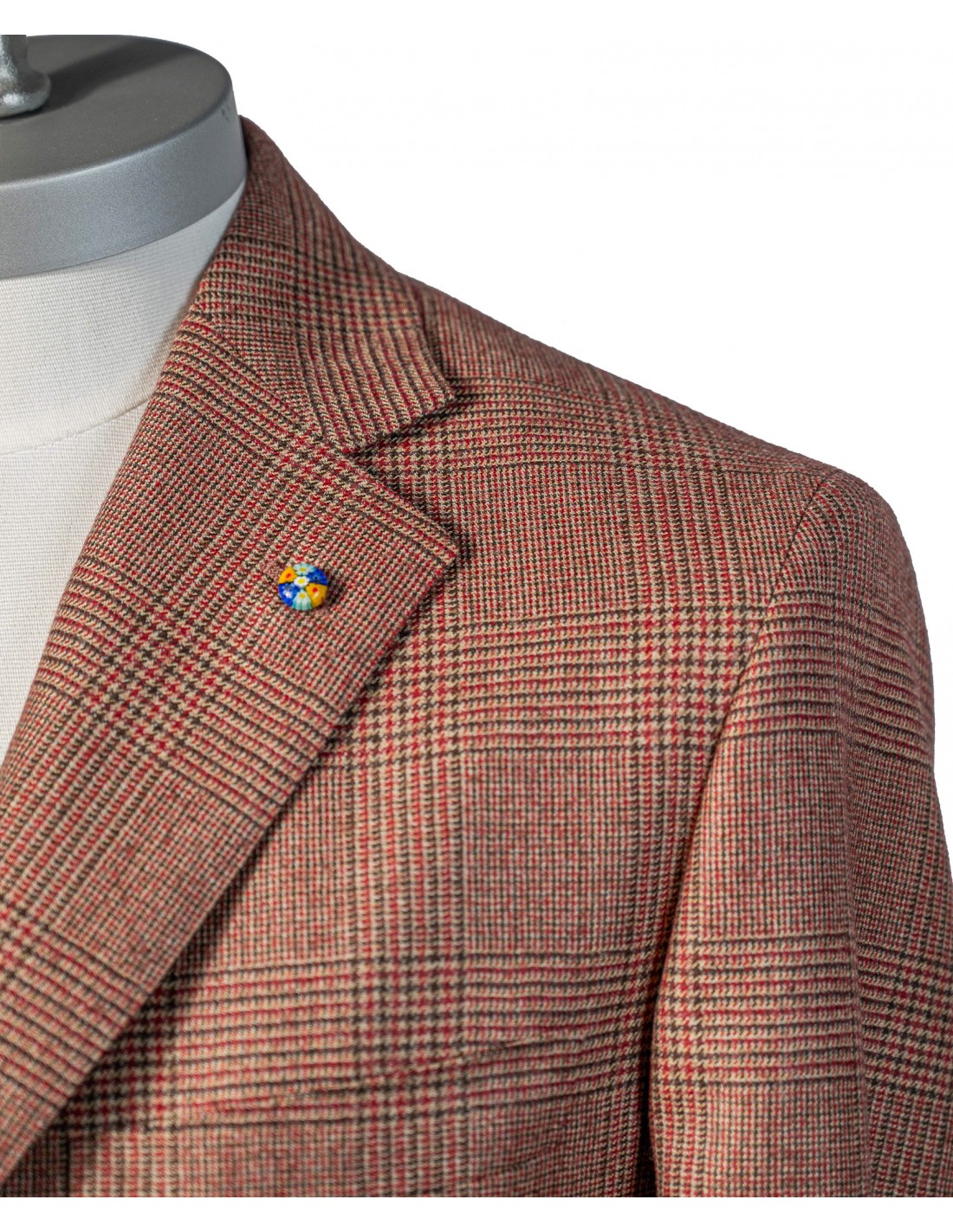 This single-breasted suit in beige Prince of Wales with red and brown checks, crafted from pure wool, combines tradition with natural comfort. A garment that reinterprets a timeless classic with a touch of modernity, ideal for facing everyday life or special occasions in style.