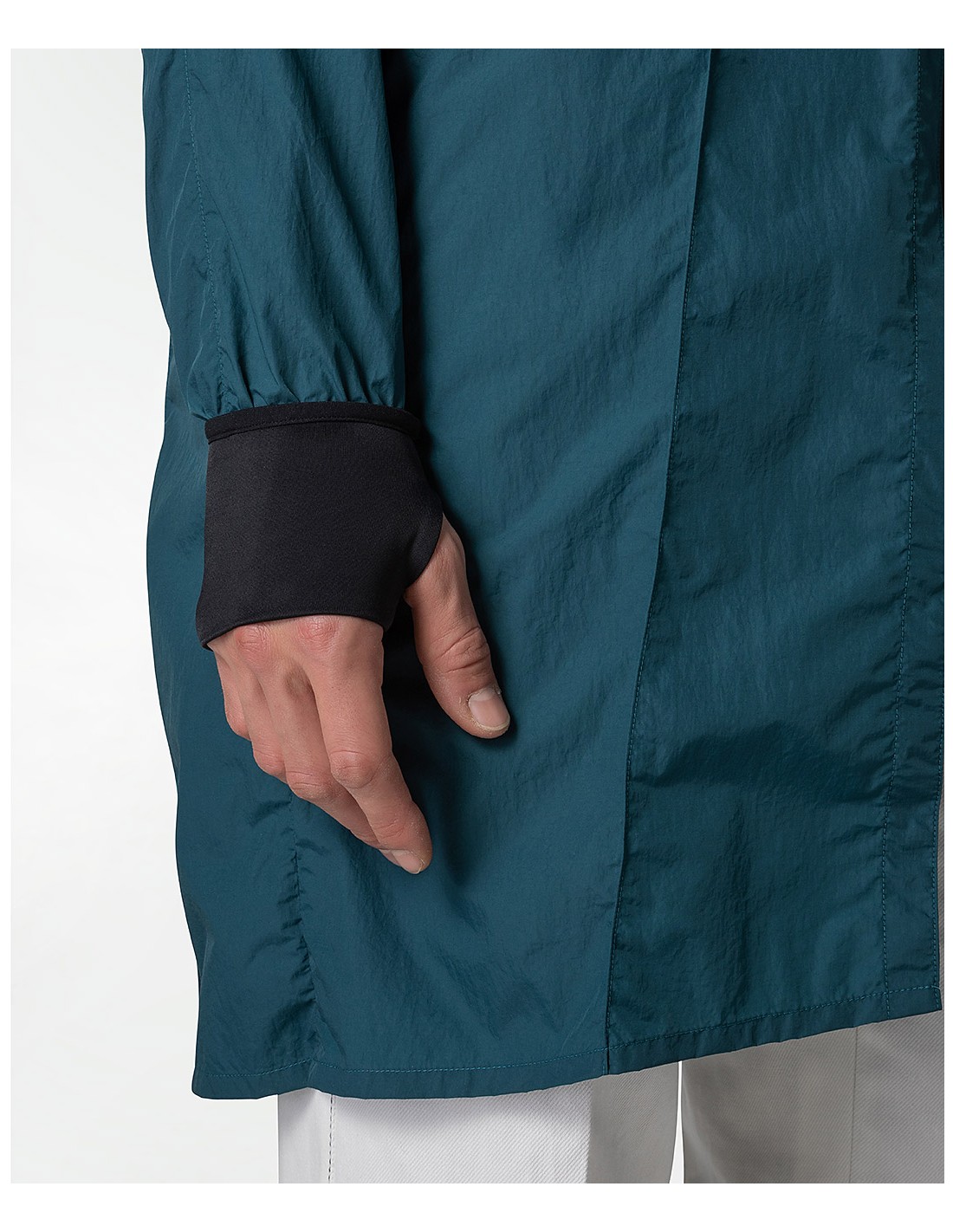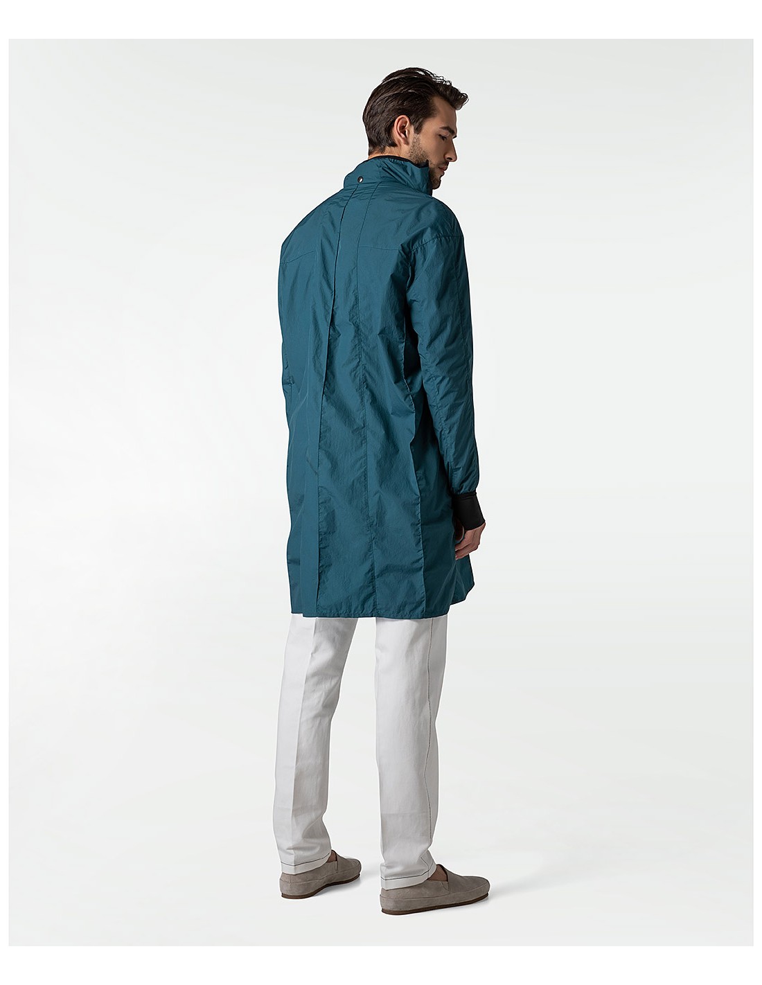 Just like you, we never take a break. We love searching for that particular detail that can help us find the balance between aesthetic modernism and traditional expertise. With the 2021 Spring-Summer Collection, we have therefore sought a technology that revolutionizes not only tailoring but even the very concept of the garment’s usability. The result is our hooded teal green jacket with adjustable burr-up lapel that can serve as a mask and cuffs with thumb loop. The special geodetic shape gives the garment a soft, regular fit, with a zip making it even more practical, allowing you to pull the jacket on quickly. With its inner zippered pocket, you can fold the jacket into a space-saving “pouch”, and put it into a suitcase, ready for your next trip. Each garment is Made in Italy in our Piazzola sul Brenta atelier, where the expert and patient hands of our master craftsmen select and work with the finest fabrics the world can offer.
