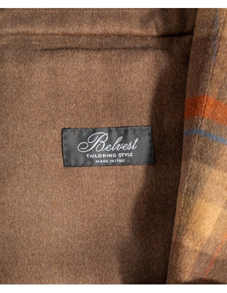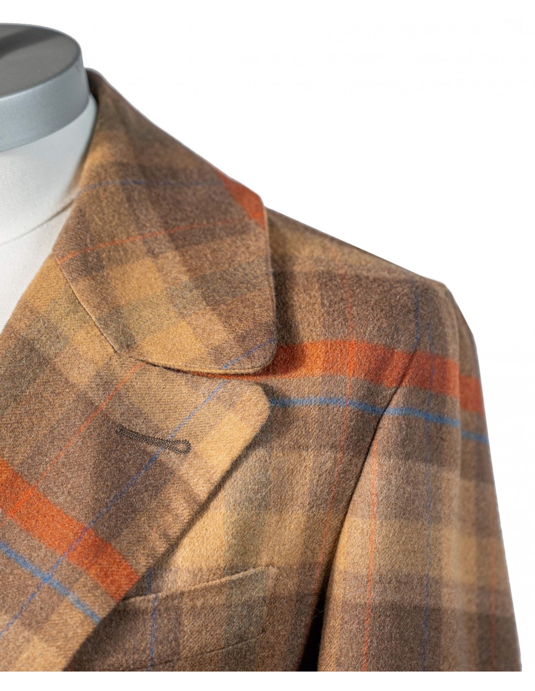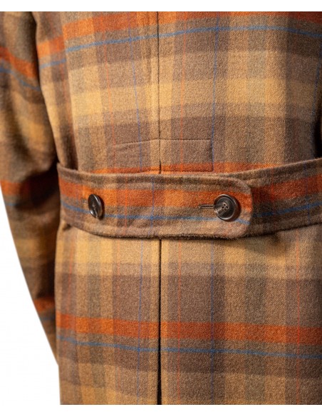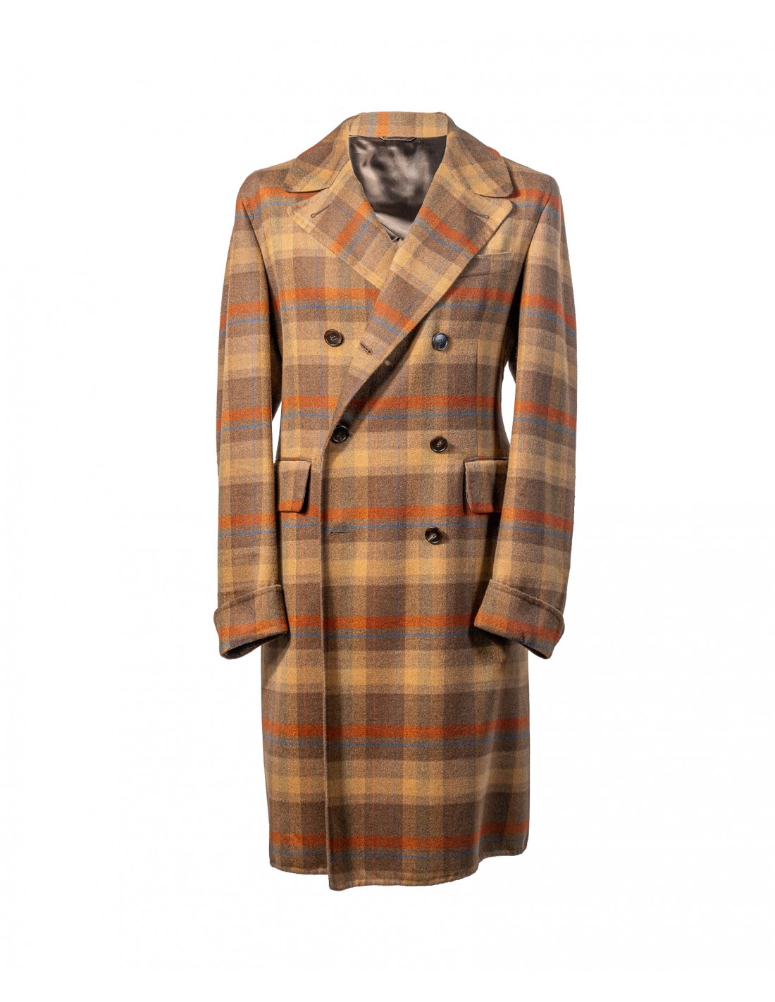 Cappotto doppiopetto double marrone e rosso con check blu in lana e poliammide.