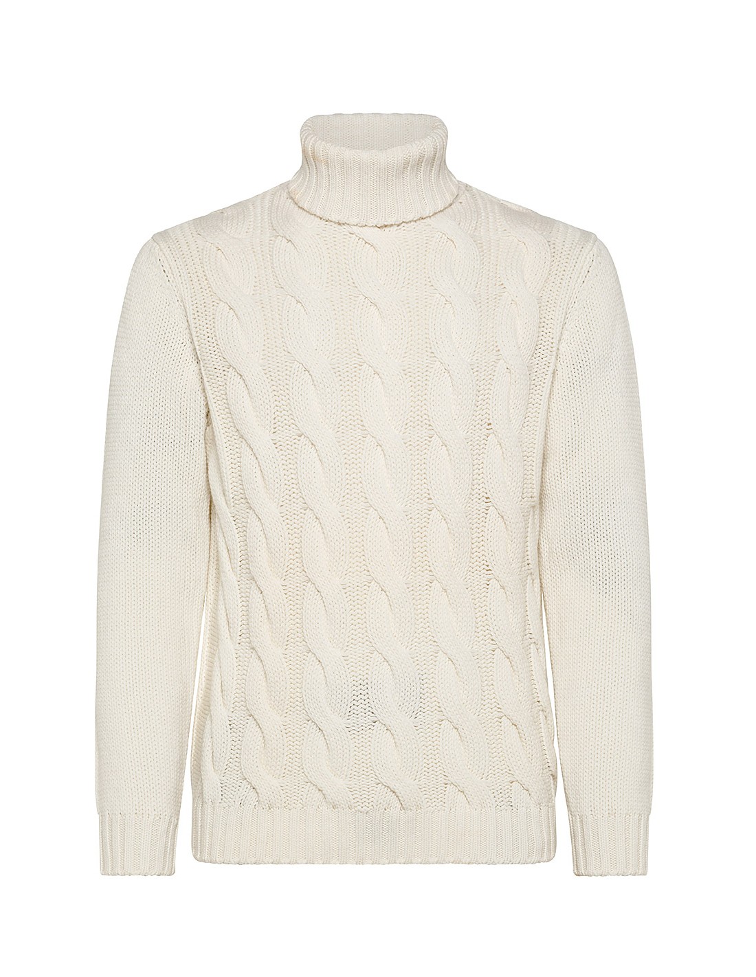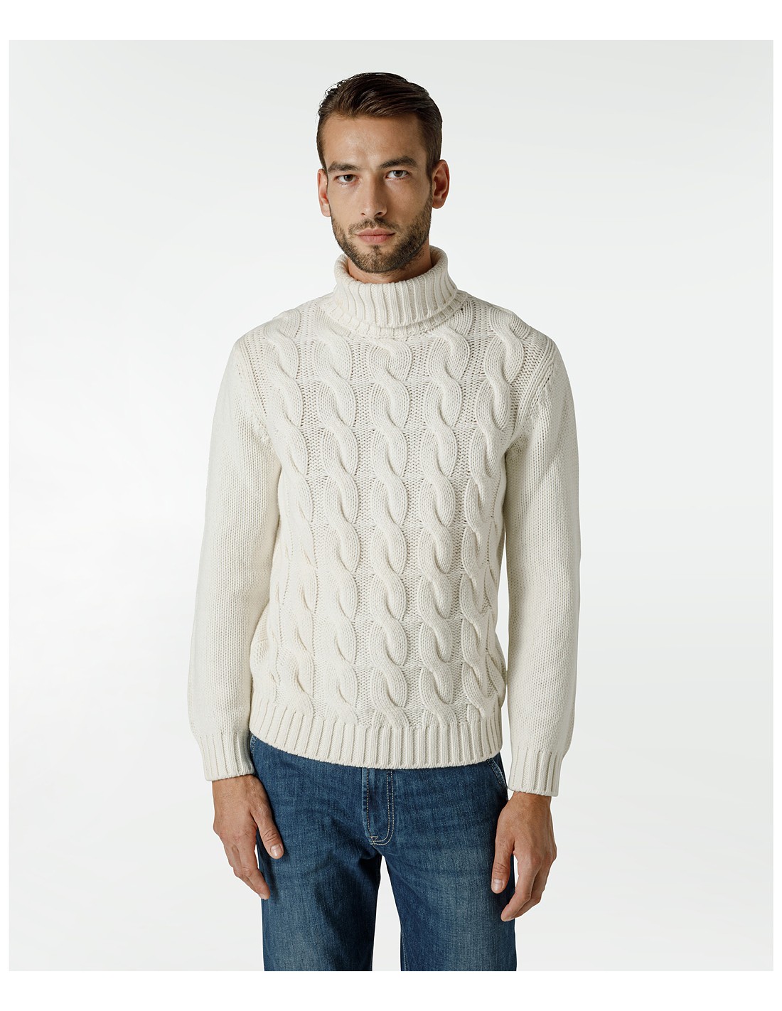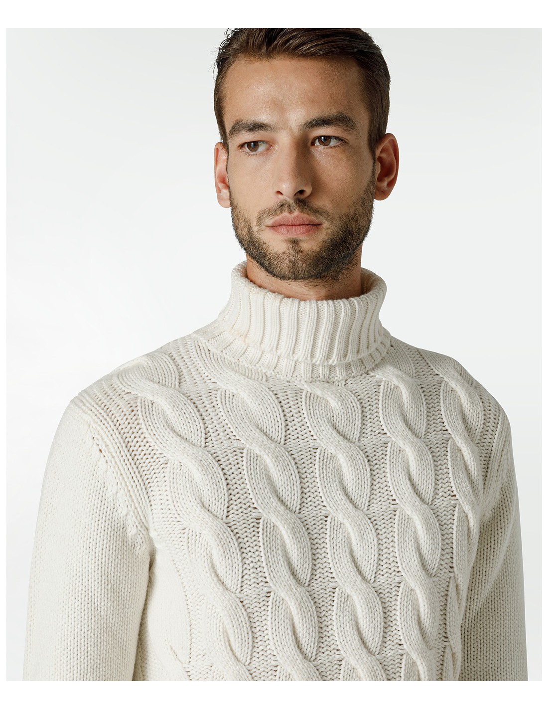 Stile sofisticato, modernità delle forme, look ricercato. La maglia a collo alto bianca in cashmere pregiato con motivo a treccia è un capo essenziale da avere nel guardaroba invernale.