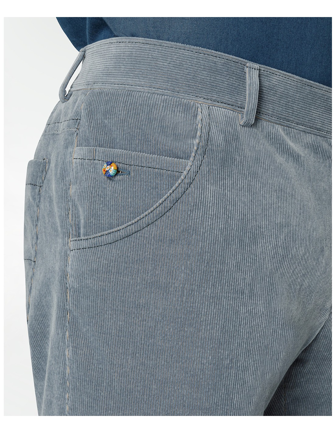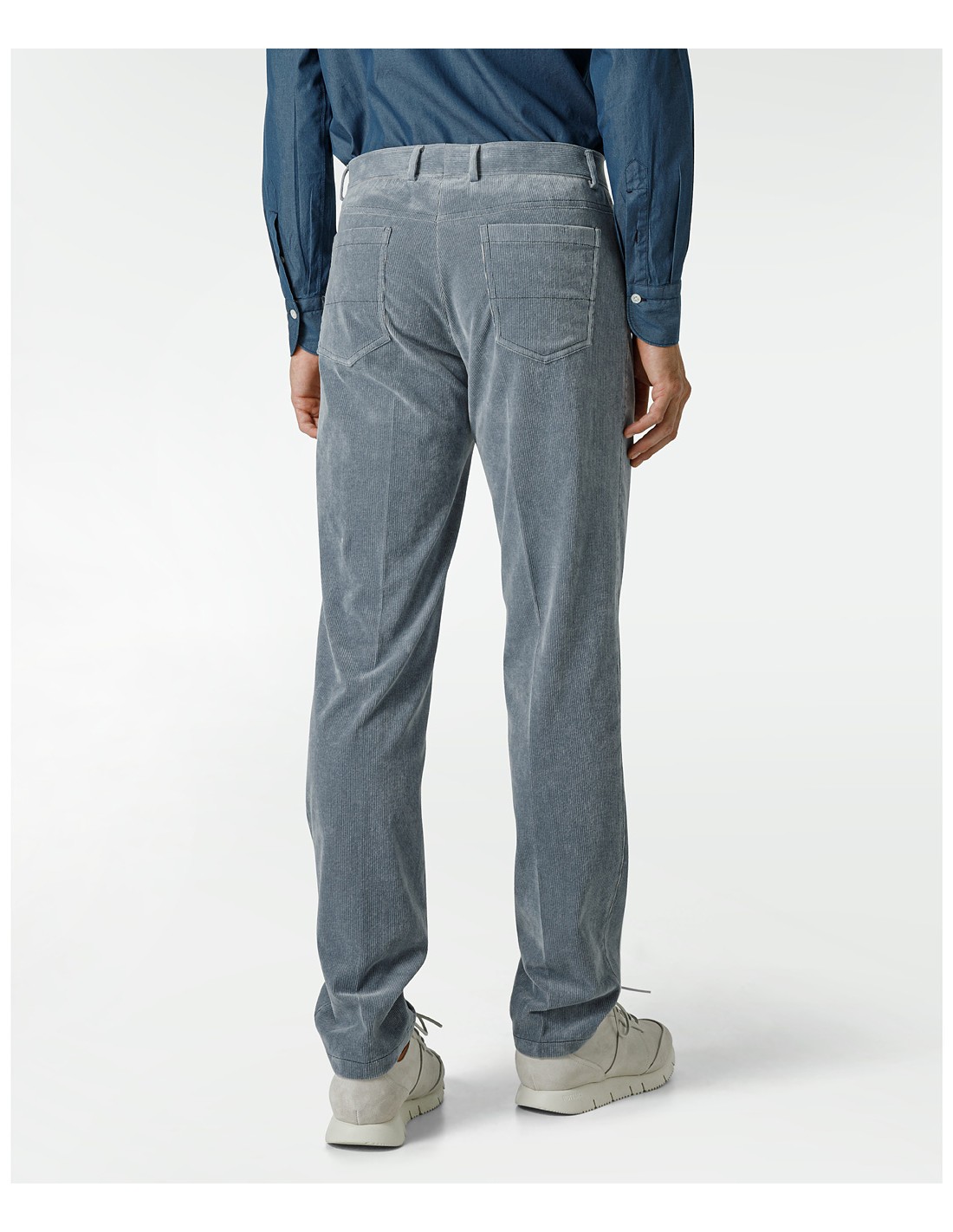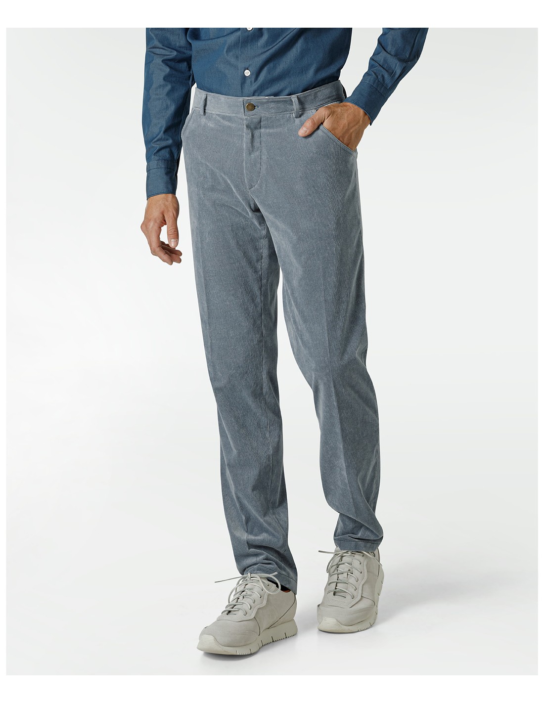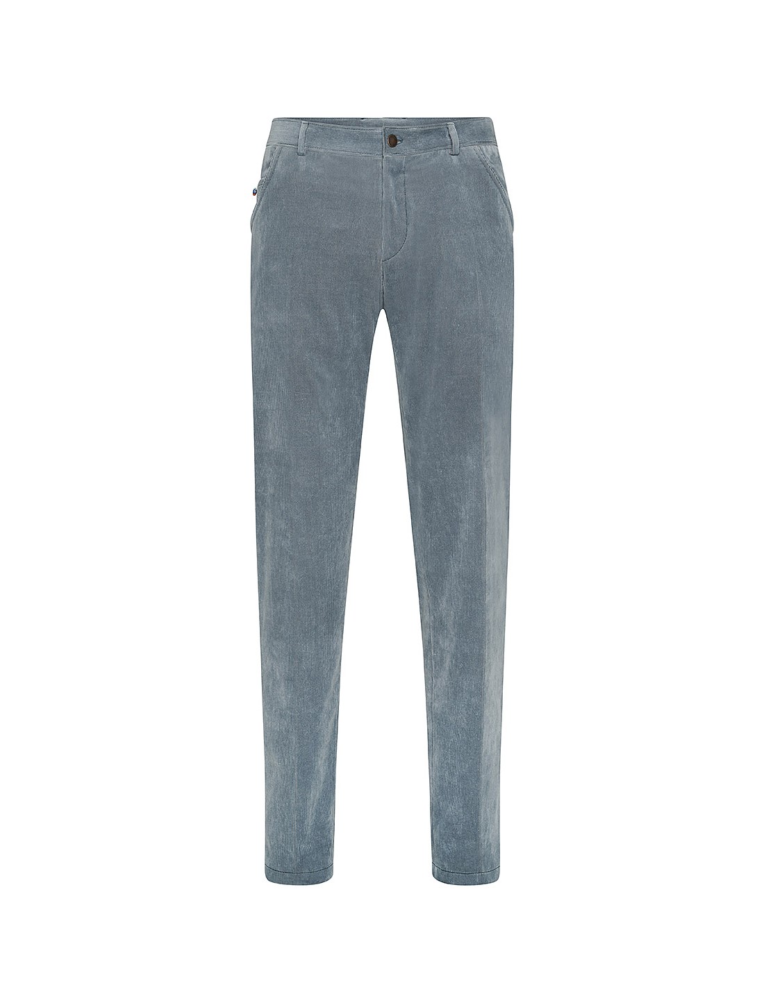Indipendente, creativo, versatile, estroverso. Abbiamo pensato a dei pantaloni che potessero farti sentire libero di esprimerti in ogni occasione. Per questo abbiamo scelto un colore speciale che simboleggiasse la tua voglia di scoprire sempre nuovi orizzonti. I pantaloni color carta da zucchero in velluto millerighe hanno una vestibilità morbida e regolare per darti il piacere di indossarli durante tutta la giornata. Raffinati e comodi allo stesso tempo, questi pantaloni azzurri da uomo sono senza pince, ideali da abbinare con la nostra giacca sartoriale grigia in lana ed elastan. Grazie alle tasche alla carrettiera, potrai portare sempre con te tutto lo stretto necessario: il portafogli, il cellulare, le chiavi della tua auto.